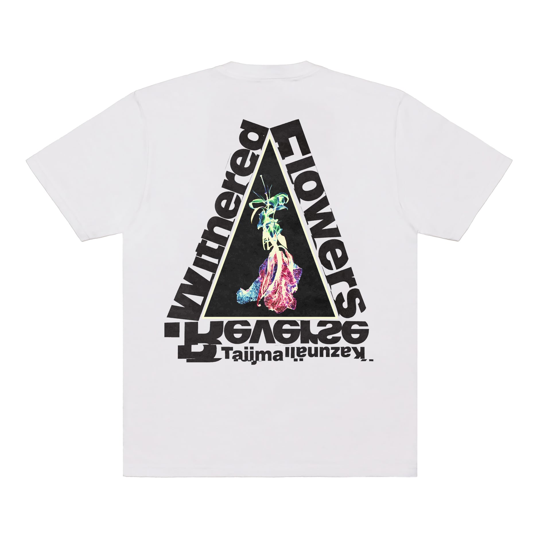 バックには WITHERED FLOWERS REVERSE シリーズのキービジュアルである、三角形が印象的な作品 “TRIANGLE DRESS” をベースに、ロゴタイプをコラージュ技法で枠組みしたデザインを大胆にプリント。