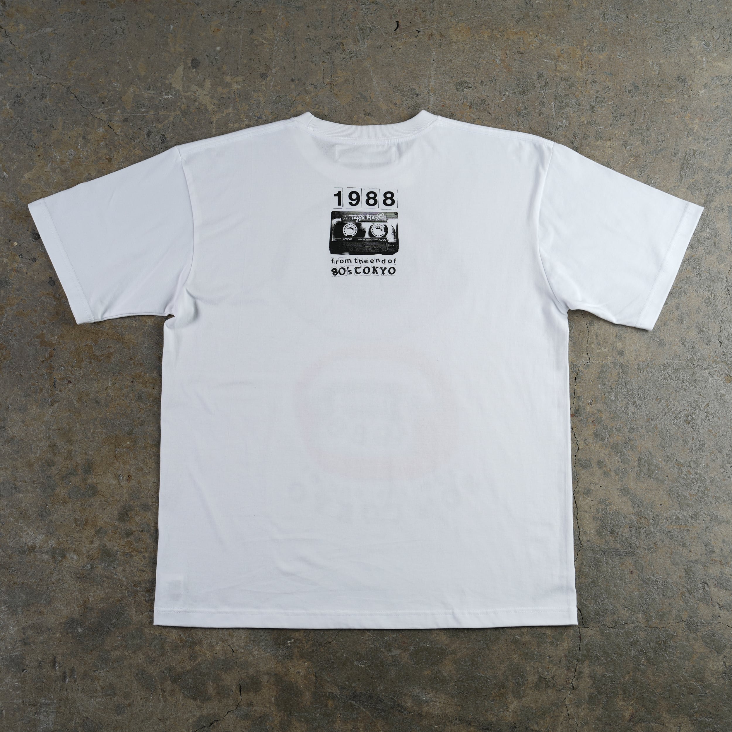 ヘビーウェイト素材の生地に、首リブの強度を保つダブルステッチと毛羽立ちを抑えるコーマ糸を採用し、プリントにはラバーインクを使用。唇をドット調で表現し、眼球にインパクトを持たせることでパンクのエッセンスを加えたシンプルながらも力強いビジュアルが特徴です。視覚的なインパクトを意図したこのデザインは、ユニークで個性的なスタイルを表現し、見る人に強い印象を残します。BACKデザインでは、カセットテープに切り貼りしたタイトル文字を組み合わせ、クラフト感のある仕上がりを演出。全体として、手作りの温かみと独自性を持つ作品に仕上がっています。